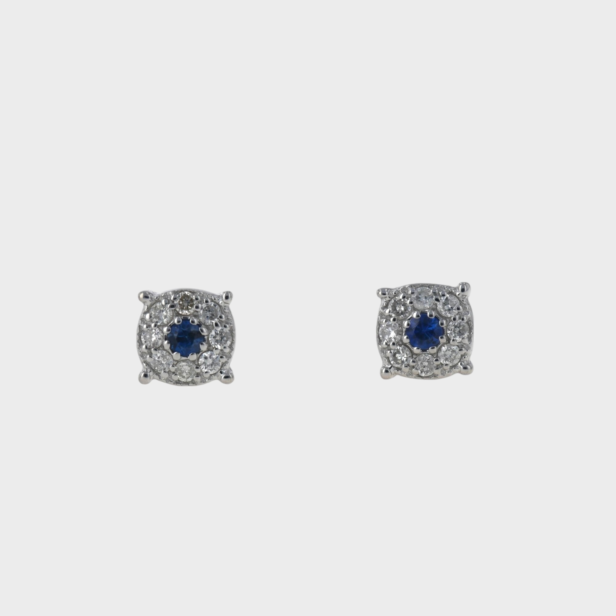 Cercei aur alb 18k, 1,97 grame, diamante ~ 0,13 ct.(16 bucati), taietura briliant, culoare G – H, claritate VS, safire ~ 0,08 ct.(2 bucati), taietura briliant, culoare albastru, dimensiune ~ 0,5 x 0,5 cm.