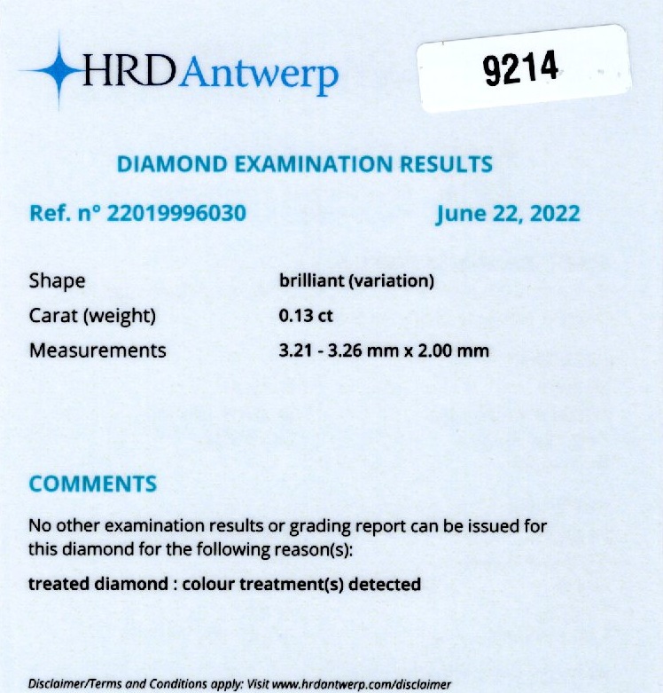 Diamant natural 0,13 ct., culoare Fancy orange(tratament de culoare detectat), forma briliant, dimensiune 3,21 – 3,26 x 2,00 mm, certificare HRD Antwerp 22019996030.
