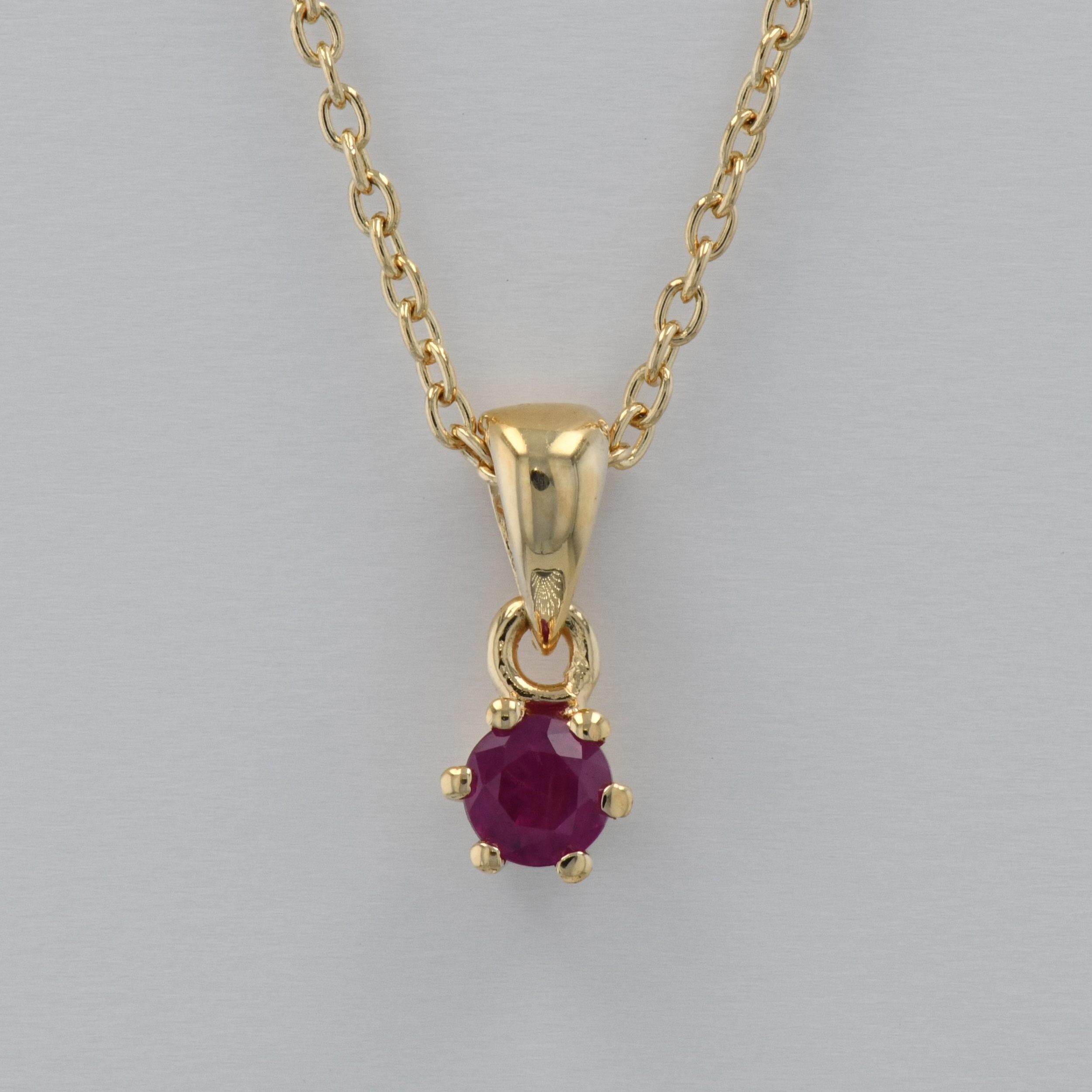Lant cu pandantiv din aur galben 18k, 2,51 grame, rubin ~ 0,17 ct., taietura briliant, dimensiune pandantiv ~ 0,41 x 1 cm, lungime lant ~ 42 cm.