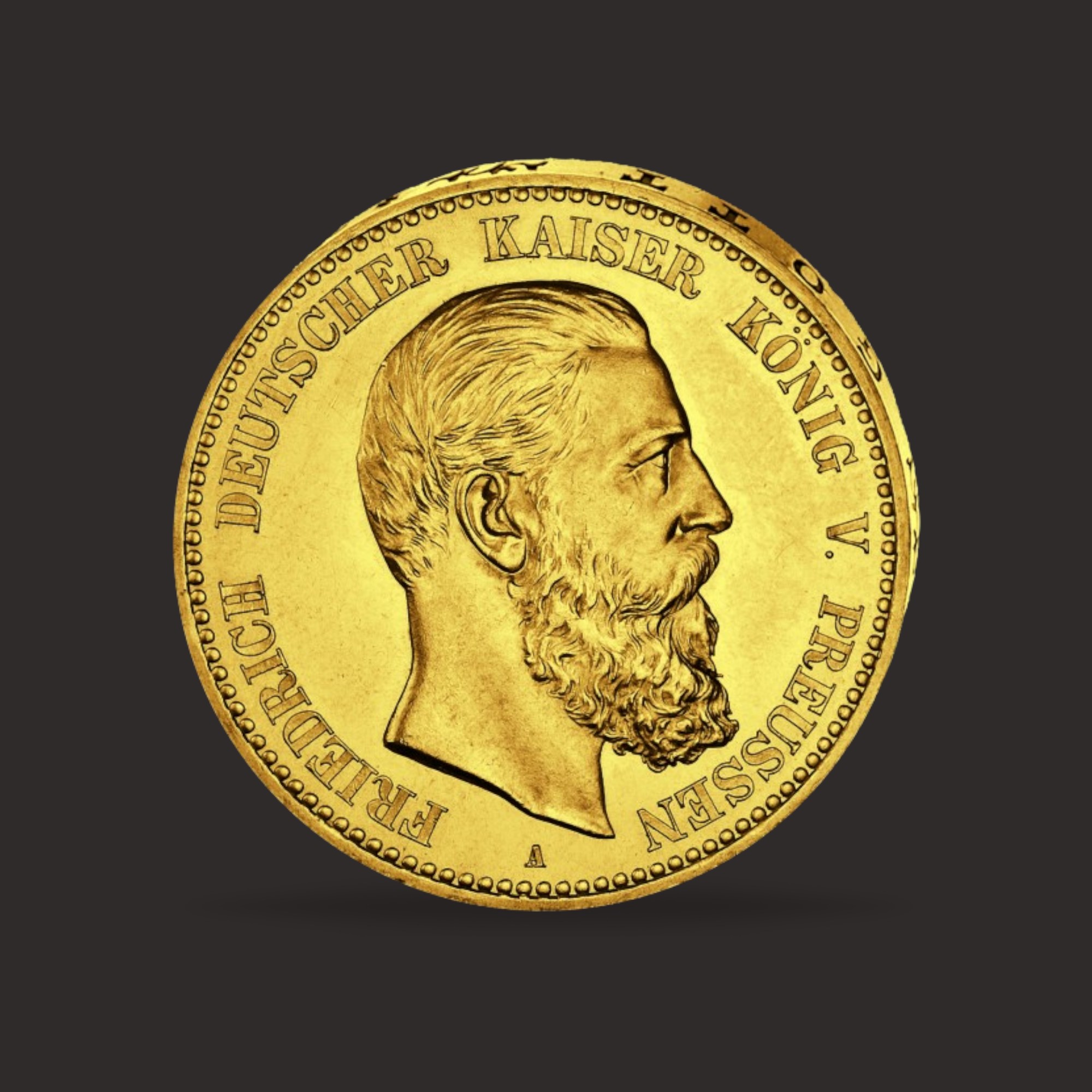– pentru anul 1888 – efigia Imparatului german si Rege al Prusiei, Friedrich III. Gravat in jurul efigiei este textul „Friedrich Deutscher Kaiser König V. Preussen”(„Friedrich Imparat german si Rege al Prusiei”), iar sub efigie este stanta monetariei.
